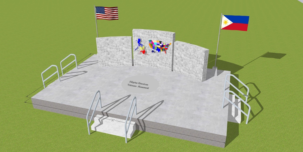 The Filipino American Veterans Monument will also be constructed in this park. The conceptual design of this monument is a 30-foot by 20-foot concrete platform with 3 segmented walls (separated walls) in the back. The walls symbolize the three major islands in the Philippines— Luzon, Visayas and Mindanao. The maps of the USA and the Philippines are etched in the middle wall symbolizing the friendship and partnership between the two countries that has started in the early 1900s. The Filipino American Military Officers Association (FAMOS) is leading the charge to raise funds for the construction of this monument. This is a once-in-a-lifetime opportunity to have your name engraved on this monument and be part of this history making. Please contact Chief Warrant Officer 4 Oscar Sa. Garcia (USN-Retired) and Oscar.sa.garcia@gmail.com or Chief Warrant Officer 2 Ernie Liwag (USN-Retired) ernieliwag@gmail.com if interested in donating for the construction of the monument.