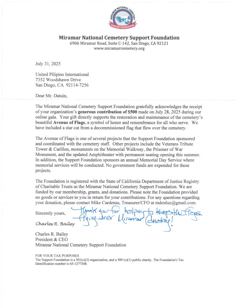 The Miramar National Cemetery Support Foundation (MNCSF), through its President & CEO Charles R. Bailey, sent an acknowledgement letter to UPI for our $500 donation to support the restoration and maintenance of the cemetery’s Avenue of Flags. Attached is a scanned copy of the letter. A star cut from a decommissioned flag that flew over the cemetery was included in the original letter.